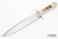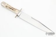 This Bowie by Chuck Roberts features a hand rub satin finished blade with a nearly sharpened top edge, .243" blade stock and 1.579" blade depth, full tang construction. The handle has a nickle silver guard and rear bolsters with stag scales. Has some light scratches, otherwise excellent condition.