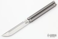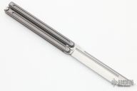 This Large Parabellum Balisong by Darriel Caston features a satin finished blade with a false top edge. The handle is composed of bead blasted titanium. Includes original box. Excellent condition.
