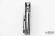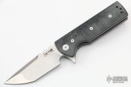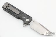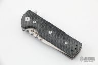 This Chaves T.A.K. features a satin finished drop point blade with the Chaves logo and a notched thumbrest. The handle has black canvas micarta scales, tumbled titanium liners and a matching reversible skull pocket clip. Comes with original box. Excellent condition.