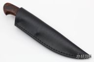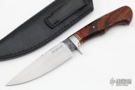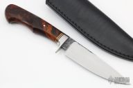 This Hunter by Milan Mozolic features a hand rub satin finished blade with forge finished ricasso, .190" blade stock and 1.205" blade depth, hidden tang construction. The handle has a stainless steel guard with black G-10 and bronze spacer, beautiful Arizona Ironwood burl grip with a single polished and domed stainless steel pin. Comes with a black leather sheath. Comes with COA. New from maker! Comes with a zippered case.