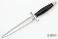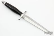 This Dagger by Pat Crawford features a satin finished double edged blade with .178" blade stock and .943" blade depth, hidden tang construction. The handle has a polished stainless steel guard and butt with a dark wood grip. Has a couple light scratches, otherwise excellent condition. Comes with a zippered case.
