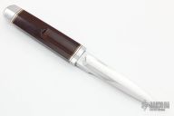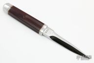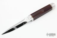 This Devil's Spike by Rod Chappel features a mirror polished double-edged blade with a hollow ground B-side, .361" blade stock and .812" blade depth, hidden tang construction. The handle features a stainless steel guard and butt, maroon linen micarta grip with black/aluminum/brass spacers.  Includes a padded zippered case. S/N 01. Has a few light scratches, otherwise excellent condition. Dated June 28th, 1983.