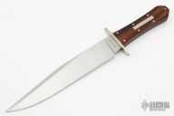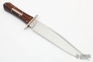 This Bowie (please let us know if you know who this maker is) features a hand rub satin finished blade with false top edge, .234" blade stock and 1.455" blade depth, hidden tang construction. The handle has a nickel silver guard and a cocobolo grip with nickel silver pins and escutcheon. Has a few light scratches and the tip is bent a little bit, otherwise good condition. #015