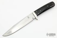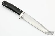 This knife by Tom Mayo features a hand rub satin finished blade with a sharpened top edge, .248" blade stock and 1.313" blade depth, full tang construction. The handle has a nickel silver guard and black linen micarta scales. This knife has some scratches and has been poorly resharpened, otherwise good condition. Comes with a zippered case.