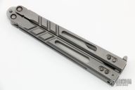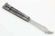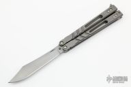 This Alpha Beast Balisong 3.0 from Blade Runner Systems (BRS) features a tumble finished clip point blade. The handle has a milled and tumbled titanium with T latch on pommel. Comes with original box and papers. Has some light scuffs and scratches, excellent condition otherwise.