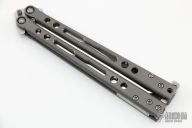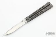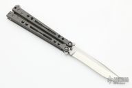 This Specter Balisong from Jerry Hom features a satin finish recurve blade with swedge. The handle is comprised of bead blasted and skeletonized titanium handles with satin titanium backspacers and T latch. Includes original box and paperwork. Excellent condition.