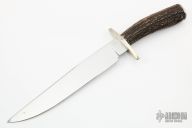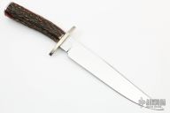 This fighter by Creason features a mirror finished blade with .165" blade stock and 1.475" blade depth, hidden tang construction. The handle has a nickel silver guard and butt with a stag grip. Has some light scratches and some light patina, otherwise excellent condition.