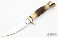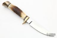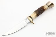 This Hunter by Red Watson features a mirror polished blade with .186" blade stock and .951" blade depth, hidden tang construction. The handle has a brass guard and butt with a stag grip. Comes with a Velcro case. Has a few light scratches, otherwise excellent condition.
