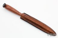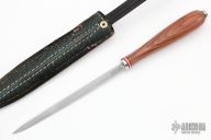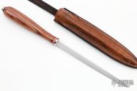 This Triangle Dagger by Dan Dennehy features a triangular shaped mirror polished blade that is .333" thick. Wood handle with red and white spacers and stainless guard and butt. Includes a leather sheath. Has a couple spots on the blade. Excellent condition. Made in the 1970's.