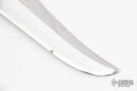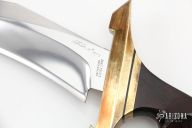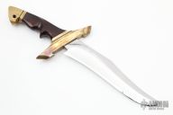 This Bowie by Rod Chappel (Davis Knives) features a mirror polished blade with a sharpened top edge, .247" blade stock and 1.945" blade depth, hidden tang construction. The handle has a brass guard and butt, cocobolo grip with black and brass spacers. Very nice figuring in the handle. Has some scratches, has a large cut in the knife edge where it obviously struck something, otherwise good condition. Dated September 12th, 1973.