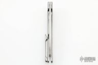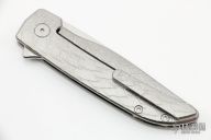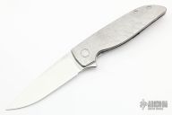 This Rask by John Grimsmo of Grimsmo Knives features an acid etched and tumble finished blade with notched flipper. The handle has a dragon scales milled and tumbled titanium frame with matching tip up clip that has hidden screws, satin titanium barrel spacers and screws. Numbered #1150 on the spine of the blade. Includes original box and COA dated July 5, 2022. New condition.