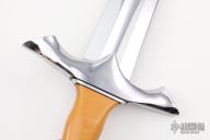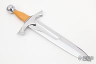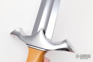 This "Gladius" by Rod Chappel features a mirror polished double edged blade with fullers, .310" blade stock and 2.484" blade depth, hidden tang construction. The handle has a mirror polished stainless steel guard and butt, yellow paper micarta grip, black/aluminum/red spacers. Has some scratches, but overall excellent condition. This knife is sterile and has no markings, but it is distinctly Rod Chappel and came to us with a large collection of Rod Chappel pieces.