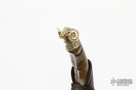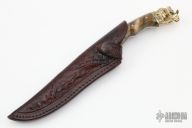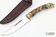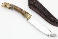 This Fixed Blade by Nikolaos Palamianakis features a polished clip point blade with fuller and fileworked spine. 0.150" blade stock and 1.094" blade depth. The handle is comprised of a brass guard with horn scales over full tang construction. Includes leather sheath and box. New from maker.