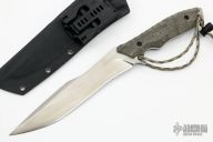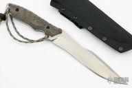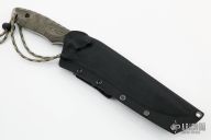 This Buster Blade "G" by Kiku Matsuda features a recurve SPG-2 Takefu San Mai Damascus blade with false top edge with notched thumbrest, .233" blade thickness and 1.640" blade depth, full tang construction. The handle has black canvas micarta scales. Comes with kydex sheath with belt clip. Excellent condition.