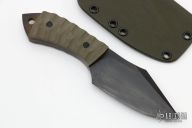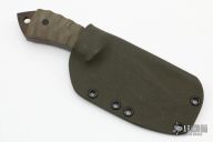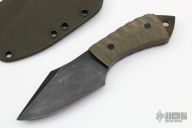 This EDC by Ben Tendick features a black blade with false top edge, .208" blade stock and 1.611" blade depth, full tang construction. The handle has sculpted green G-10 scales with red G-10 liners. Comes with a kydex sheath. Excellent condition.