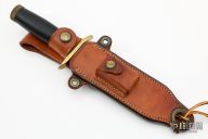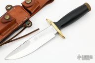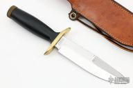 This combat fixed blade by Bianchi features a spear point mirror polished blade with serrated and sharpened top edge, .202" blade stock and 1.361" blade depth, hidden tang construction. The handle has a brass S-Guard, black composite handle that is hollow, and a removable brass butt cap. #0605. Comes with original brown leather sheath. Excellent condition.
