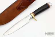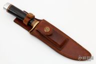 This Model 5-6 by Randall Made Knives features a satin finished blade with false top edge, .234" blade thickness and 1.133" blade depth, hidden tang construction. The handle has a brass guard, stacked leather grip with red/white/blue spacers and a duralumin butt with round tang nut. Comes with a HH. Heiser brown leather sheath with brown buttons and a Norton 2-Grit Stone. Has some scratches and, has been resharpened, good condition for its age. Comes with zippered case.