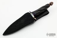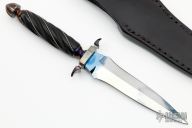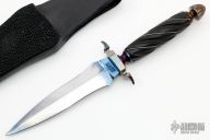 This small dagger by Todd Kopp features a double edged blade that was blued, but the bluing has been rubbed off, .183" blade stock and 1.017" blade depth, hidden tang construction. The handle has a blued steel guard and butt, spiral fluted and silver wire inlaid blackwood grip. Comes with a black leather sheath with stingray skin overlay and a zippered case. Has a few light scratches and the blued finish removed from the blade, otherwise good condition.