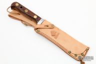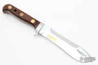 This Vintage White Hunter by Puma is the ultimate outdoorsman’s knife, originally designed by African professional hunters. It features a curved blade for cutting, slicing and skinning and a strong back edge for hacking. Handmade by skilled craftsmen with cocobolo scales. Comes with original brown leather sheath, box and papers. Has a couple light scratches, otherwise excellent condition. #41371 on guard.