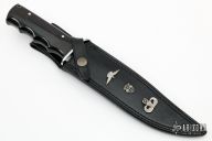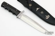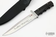 This Bowie from Al Mar features a satin finish, clip point bowie style blade, .232" blade stock and 1.416" blade depth, full tang construction. The handle is comprised of stainless steel guard and black/brown paper micarta handles with lanyard tube in pommel. Comes with black leather sheath. This is one of 80 made. Blade reads "Col. James N. Rowe U.S.A S.F." "De Oppresso Liber" "Duty-Honor-Country" "2/8/38 - 4/21/89". James Rowe was a Medal of Honor winner. Excellent condition.