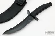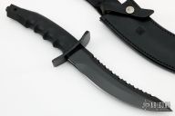 This Black Warrior from Al Mar Knives features a black coated blade with serrated top edge, .236" blade stock and 1.484" blade depth, hidden tang construction. The handle has a black stainless steel double guard, black rubberized handle, and a black stainless steel butt. Comes with original black leather sheath. Has a couple light scratches, otherwise excellent condition.