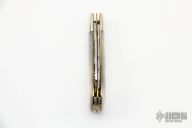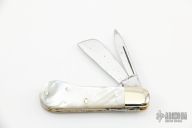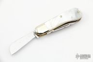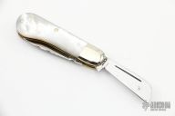 This slipjoint by "Mik" (please let us know if you know more about this maker) features two mirror polished blades with nail nicks and fileworked spines. The handle has nickel silver bolsters, mother of pearl covers, brass liners, fileworked steel springs. Has some light scratches and patina, otherwise excellent condition.