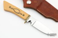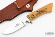 This hunter by TJ Yancey features a mirror finished drop point blade, .192" blade stock and .935" blade depth, full tapered tang construction. The handle has ivory/yellow paper micarta scales with black liners, engraved brass pins and scrimshaw on the handle, signed A. Yancey. Comes with a brown leather sheath. Excellent condition. #297 on the blade.