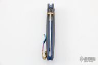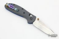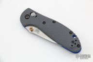 This 556-1 Mini Griptilian by Benchmade features a tumble finished clip point blade with swedge, dual thumb studs and notched thumb rest. The handle is comprised of textured gray G10 scales over blue liners, stainless steel sub frame and blue anodized aluminum barrel spacers. The deep carry, tip up clip is reversible for right or left hand carry. Lanyard hole in pommel. Includes original box and papers. Excellent condition.