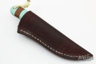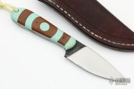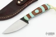This knife by TM Hunt features a satin finished blade with .119" blade stock and 1.243" blade depth, full tang construction. The handle has G-10/canvas micarta scales. Comes with a brown leather sheath. Has some oxidation on the tang, otherwise excellent condition.