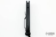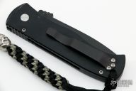 This Emerson/Pro-Tech CQC7 automatic has a chisel ground two tone blade with a plain edge and a solid black aluminum handle with Punisher logo. Black coated stainless steel clip. Coil spring. Comes with original box and papers. Has some scuffs, otherwise excellent condition.