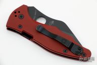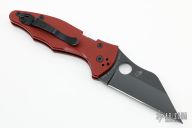 This Yojimbo 2 by Spyderco features a black finished wharncliffe blade with thumbhole. The handle has a red coated G-10 scales with nested stainless steel liners, lock is on the spine of handle. 4-way reversible stainless steel clip. Nice detent, lockup and blade seating. Comes with original box and papers. Excellent condition.