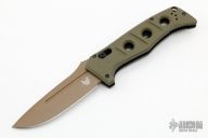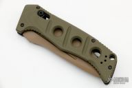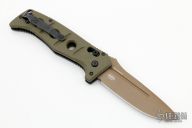 This Siebert designed 2750FE-2 Adamas Auto Axis Lock has a FDE coated D2 stainless steel drop point blade with fullers and notched thumbrest. Handle is OD G-10 over black stainless steel liners, reversible tip up black stainless steel clip, and spine safety button. Includes tan nylon sheath. Comes with original box and papers. Excellent condition.