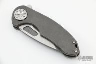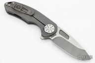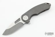 This F3 by Curtiss Knives features a stonewashed Magnacut blade with notched thumbrest and flipper. The handle has a tumbled titanium frame with a matching tip up titanium clip. Satin stainless hardware. Rides on bearings, nice detent and lockup.  Comes with original box, zipper case, COA, patch and sticker pack. Excellent condition.