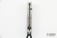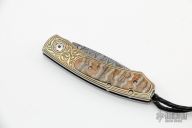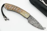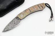 This B09 Kestrel Destiny by William Henry is #123 of 250. It features a Mike Norris Hornets Nest Damascus blade with single thumbstud with a smokey quartz set in an 18kt gold bezel. The handle has a stainless steel frame that has 24kt gold koftgari, smokey quartz set in 18kt gold bezel in push button, mammoth tooth inlays, sterling silver lanyard bail with leather lanyard and silver beads. Comes with a black leather pocket sheath with clip, original box and papers. Excellent condition.