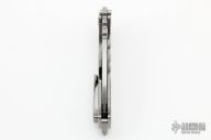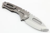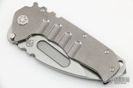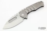 This Praetorian T frame lock folder by Medford Knives has a satin finished tanto blade with dual thumb studs and fullers. Handle has a terminator finish frame, D2 backspacer and tip up titanium clip. Blade is centered when closed, nice lockup and detent. This frame lock comes in the original hard case and paperwork. Shows no signs of carry. Excellent condition.