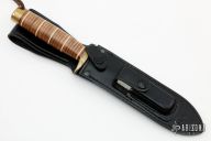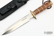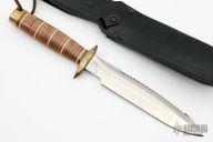 This SSD89 Scuba/ Demo knife by SOG has a satin finished stainless steel spear point blade with serrations at top edge, .221" blade stock and 1.303" blade depth, hidden tang construction. The handle has a brass guard and butt, stacked leather grip with white spacers, lanyard hole. Comes with black leather sheath with button closure, belt loop and sharpening stone pouch and stone. Excellent condition.