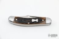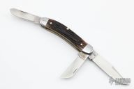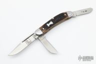This 3-blade Sowbelly from Queen Cutlery Company is a Bill Ruple design and is 1 of 150. It features satin finished blades with nail nicks. The handle has stainless steel bolsters and jigged bone covers over brass liners, stainless steel springs. Has some light scratches, otherwise excellent condition. Includes a zippered case.