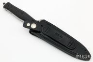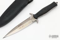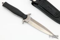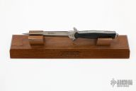 This Mark I by Gerber features a double edged satin finished blade, .228" blade stock and .953" blade depth, full tang construction. The handle has black G-10 scales with extended tang pommell. Comes with a black leather sheath and wooden display stand. #0259on blade. Marked "Mark I" and "1976-2011" on blade. Excellent condition.