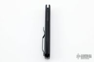 This knife features a black sterile blade. The handle has a black aluminum frame with black hardware and black stainless steel tip up clip. There is a lantern inlaid into the push button. Comes with original box and papers. New from maker.