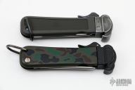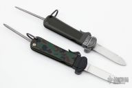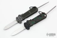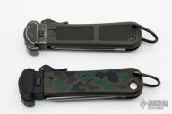 This pair of gravity knives features a camo one from China and the other is from German. They have spear point blades. The handles are metal and plastic. D Ring lanyard bail on pommel. Knife also features a steel C4 punch/Marlin spike that deploys to the rear of the knife. Excellent condition.