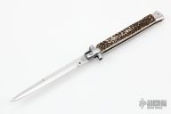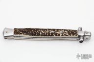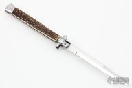 This Swivel Bolster from ACK Italy features a polished blade. The handle is comprised of stainless steel bolsters and pommel and stag scales over brass liners and steel backspacer. Has a couple light scratches, otherwise excellent condition.