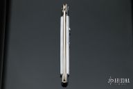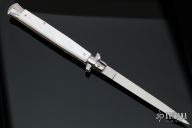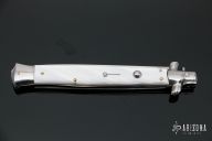 This Swivel Bolster Auto by Edgeco features a polished drop point blade with nail nick. The handle has stainless steel bolsters and butt, white pearlex scales, brass liners. Excellent condition.