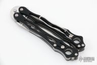 Spyderco's original SmallFly was a uniquely different "spin" on the balisong or Filipino butterfly knife. Now this remarkable design is back with a full-flat-ground drop point blade profile crafted from CPM-S30V stainless. Like the original, it features skeletonized twin handles with full stainless steel liners and peel-ply-textured scales. The Round Holes at the butt end of both handles reflect Spyderco's iconic trademark and help achieve optimal balance for high-speed manipulation. A spring-loaded latch attached to the "free" handle secures the handles together in the closed position, while the removable wire pocket clip may be attached to either side of both handles as both a carry option and tactile index.