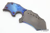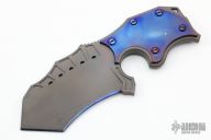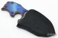This knife by Metal Worn features a bead blasted and anodized titanium blade with anodized titanium scales and hardware, notched thumbrest, .239" blade stock and 2.225" blade depth, full tang construction. Comes with a black leather sheath. Has some scuffs and scratches, otherwise good condition.