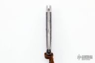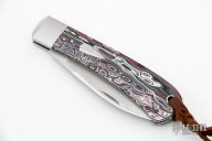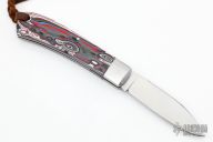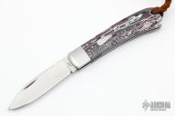 This Zulu Spear by Tobin Hill features a hand rub satin finished blade with a nail nick.  The handle features stainless steel bolsters, Fordite covers, stainless steel liners, escutcheon and spring. Has half-stop, flush in all positions. Comes with a zippered case. Has a few light scratches, otherwise excellent condition.