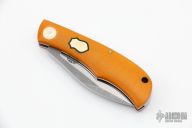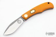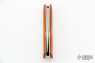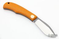 This slipjoint by Chris Taylor features a satin finished blade with tumbled flats. The handle has vintage GE Textolite covers, copper/bronze/stainless steel pivot, stainless steel liners and spring. Bronze shield with black Westinghouse micarta border. Has half-stop, flush in all positions. Comes with a zippered case, black leather sheath and COA dated 9/4/21. Excellent condition.