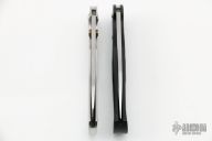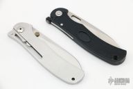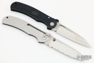 The other knife has a satin finished blade with thumbhole. The handle is black composite with stainless steel backspacer. Excellent condition.