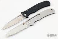 This orignial One Handed Folder by A.G. Russell features a satin finished drop point fully serrated blade with dual brass thumbstuds. The handle is comprised of an integral stainless steel frame with lanyard hole on pommel. Has some scratches, othewise good condition.