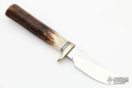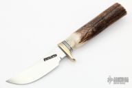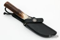 This Randall Made Model 21 has a satin finished upswept blade with notched thumbrest, .163" blade stock and a blade depth of .842", hidden tang construction. The handle has a nickel silver guard with a stag grip, black/duralumin spacers. Knife comes with a black leather sheath and zippered case. Has some light scratches, otherwise excellent condition.