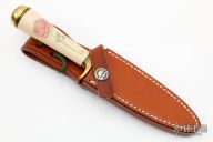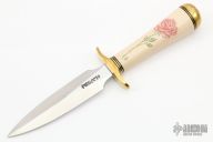 This Model 2-4 by Randall Made Knives features a satin finished double edged blade, .153" blade stock and .898" blade depth, hidden tang construction. The handle has brass guard and butt, ivory paper micarta grip with black/brass spacers. The handle has been scrimshawed with a rose. Comes with brown leather sheath and a Randall zippered case.